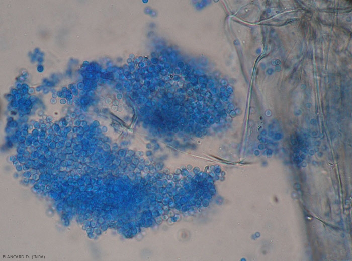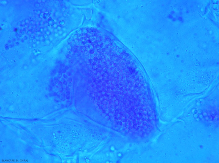 • Conseils : au laboratoire, les sporanges des Mucorales et des agents de mildious foliaires sont plutôt aisément observés à l'aide d'une loupe binoculaire et d'un microscope photonique. Ceux des pathogènes racinaires sont plus difficiles à détecter : les Pythium spp. sont plutôt peu visibles dans les tissus végétaux altérés. C'est moins le cas des Phytophthora spp., et encore moins des Olpidium spp. qui sont bien visibles dans les cellules du cortex des racines de divers légumes (salades, concombre, tomate, etc.). Si les sporanges desagents de mildious sont ne sont pas visibles sur les tissus foliaires, placer les échantillons dans une chambre humide et réaliser des observations à intervalles réguliers par la suite.