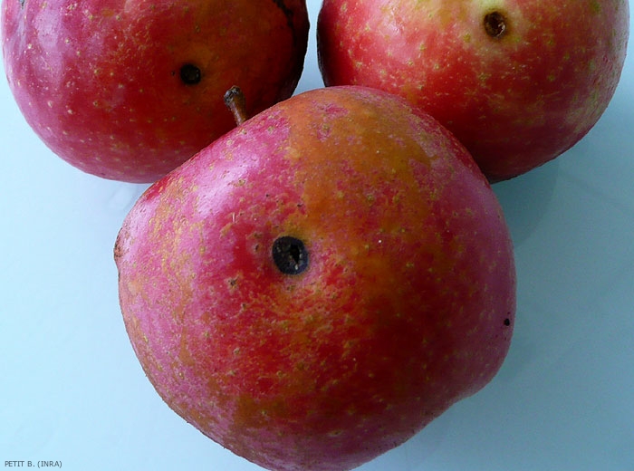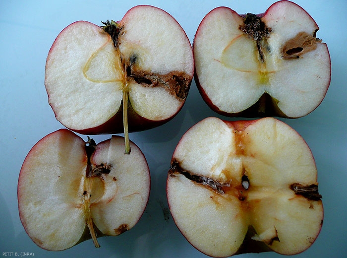 La larve possède un stade baladeur qui peut durer deux jours (légères morsures en surface). Le point de pénétration de la larve est souvent au contact de deux fruits, d’un fruit et d’une feuille ou dans la cavité de l ’œil (figure 1). Au début, les galeries sont en spirale et toujours encombrées de déjections (figure 2). La larve se dirige vers la cavité carpellaire et s’attaque aux pépins (figure 3), ce qui provoque la chute du fruit (caractéristique du carpocapse). En grossissant, elle agrandit sa galerie ou en creuse une seconde pour sortir (figure 4). De plus, le carpocapse est potentiellement vecteur de moisissures, dont celles du genre Penicillium, champignons qui favorisent l'apparition de patuline, toxine réglementée dans les jus et produits transformés.