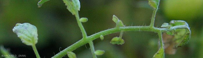 - Symptômes types : rabougrissement des plantes, épinasties, décolorations foliaires, éclaircissement ou nécrose des nervures, déformations foliaires, lésions nécrotiques foliaires locales ou généralisées, mort des plantes.