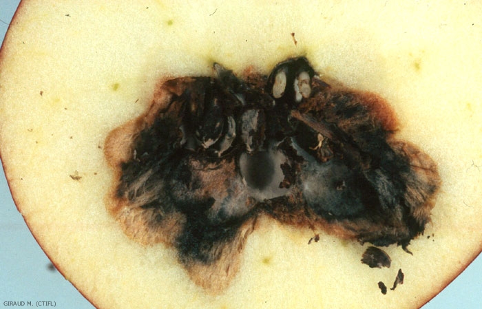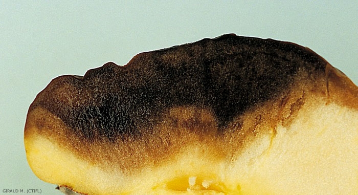 Sur fruits en conservation : nécrose noire au début (Figure 1), assez ferme, à contours plus ou moins irréguliers, qui évolue ensuite en marron et devient molle (Figure 2). En conditions humides, un feutrage gris cendre à reflets olivâtre apparaît. Il porte des spores caractéristiques du genre Alternaria. A la coupe, la chair est noire dans la zone nécrosée (Figure 3). Lorsqu’il y a pourriture du cœur, celle-ci est d’un noir intense et se poursuit dans la chair par diverticules (Figure 4).