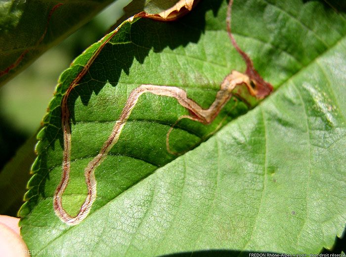 Les dégâts sont facilement identifiables. La larve de la mineuse des feuilles des arbres fruitiers creuse des mines qui serpentent dans le limbe sans tenir compte des nervures (figures 1 et 2). En fin de cycle, la mine s’élargit en une cellule terminée en cul-de-sac. La chenille sort de la feuille pour se nymphoser.