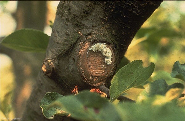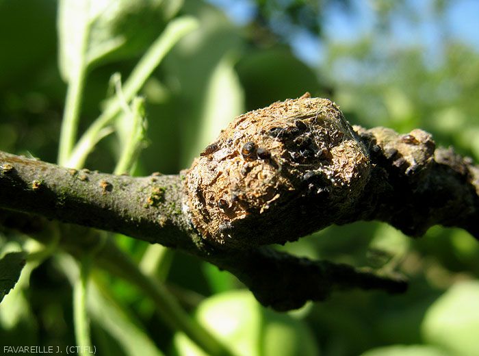 Sur les rameaux et les branches (figure 1), les piqûres des pucerons provoquent la formation de boursouflures puis de galles (figures 2 à 4) et enfin de chancres qui peuvent permettre l’attaque de pathogènes secondaires, notamment des champignons.