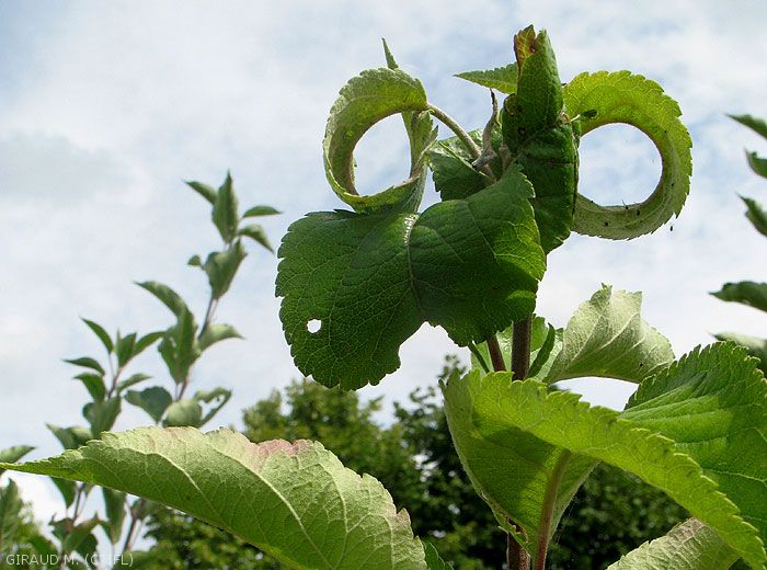 Les colonies importantes (figures 1, 2 et 3) provoquent l’enroulement et la déformation des feuilles (figures 4 à 10) et des rameaux (pseudo-galles).