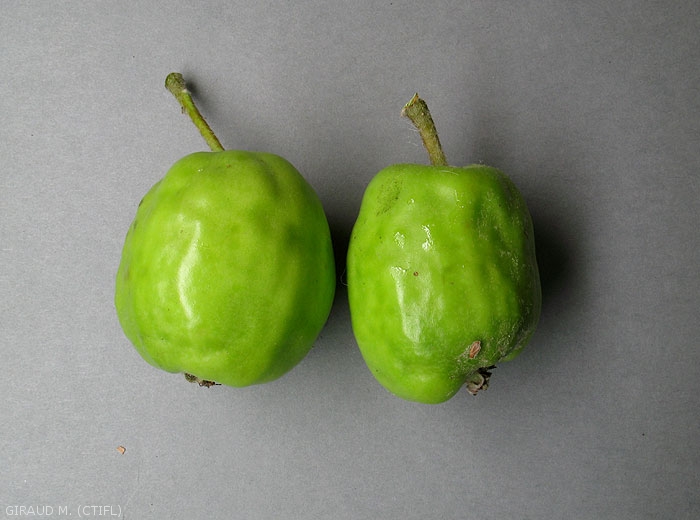Il y a arrêt de croissance des pousses. Au printemps, les attaques importantes provoquent la déformation des jeunes fruits (figure 11) qui restent bossus et de petite taille et entraînent une dépréciation de la récolte.