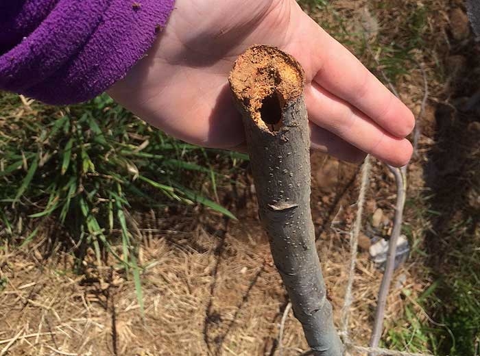 La jeune larve s’attaque d’abord aux extrémités des jeunes pousses dont elle provoque le dessèchement. Au cours de leur développement, les larves migrent par l’extérieur, au niveau des branches et des troncs, et y creusent des galeries ascendantes (figures 1 et 2). Les indices de la présence de chenilles sont l’accumulation d’excréments et de particules de bois qui sont rejetées par les trous d’entrée et le dessèchement des branches qui peuvent casser sous l’action du vent (figures 3 et 4).