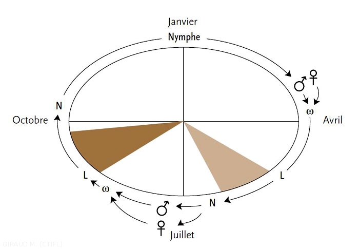 L’adulte mesure douze à dix-sept mm d’envergure (figure 1). Les mâles et les femelles sont très semblables. Les ailes antérieures sont de couleur ocre clair, avec trois bandes de couleur brun ferrugineux. Les ailes postérieures sont d’un gris argenté, avec des franges blanchâtres. Les œufs sont pondus en ooplaques sur la face supérieure des feuilles mais parfois sur les rameaux (première génération). Ils sont de couleur jaune citron, puis brun clair. Ils sont recouverts d’un film transparent très résistant. La chenille, d’un vert clair translucide, mesure quinze à dix-huit mm à son complet développement. La larve de première génération s’abrite dans un fourreau soyeux, le long de la nervure centrale, à la face inférieure. En saison, elle se réfugie à l’abri d’une feuille, contre un fruit, dans la cuvette pédonculaire. La chrysalide mesure huit à neuf mm. De couleur verte à sa formation, elle devient ocre à brunâtre. L’hibernation s’effectue à l’état de chrysalide, en véritable diapause nymphale dans des feuilles desséchées, collée aux rameaux ou au sol. Deux à trois générations se succèdent dans l’année (deux générations en zones septentrionales). Les premiers papillons apparaissent fin mars et le vol s’étale sur un mois. L’accouplement est immédiat. La ponte, qui a lieu six à huit jours après, ainsi que la période d’incubation sont influencées par les températures et le degré d’insolation. Les larves de première génération apparaissent en avril-mai, sur diverses plantes herbacées du verger et de son environnement. Sur pommier, elles se nourrissent de feuilles et occasionnellement de jeunes fruits. Le deuxième vol a lieu en juin. En zones méridionales, les chenilles parvenant au terme de leur développement en août donnent des chrysalides et se transforment en papillon la même année. La troisième génération évolue jusqu’ en octobre-novembre.