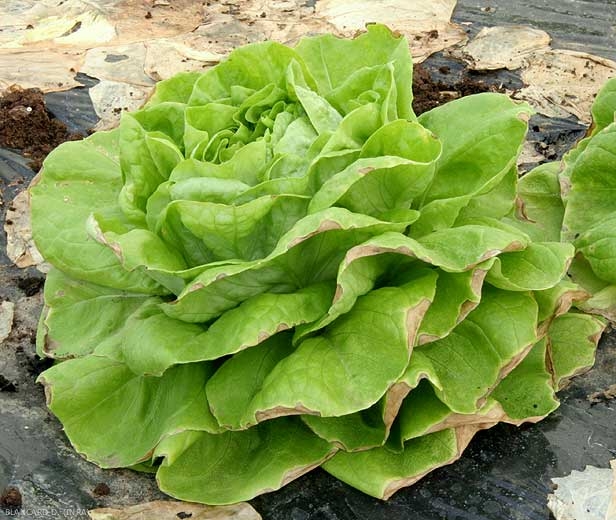 Maladies des légumes associées à l'élément : nécroses marginales de la laitue (figures 1 et 2) et de l'épinard, probablement le coeur noir du céleri, nécrose apicale de la tomate (figures 3 et 4), vitrescence du melon (figure 5), noircissement des fleurs du chou fleur, etc.