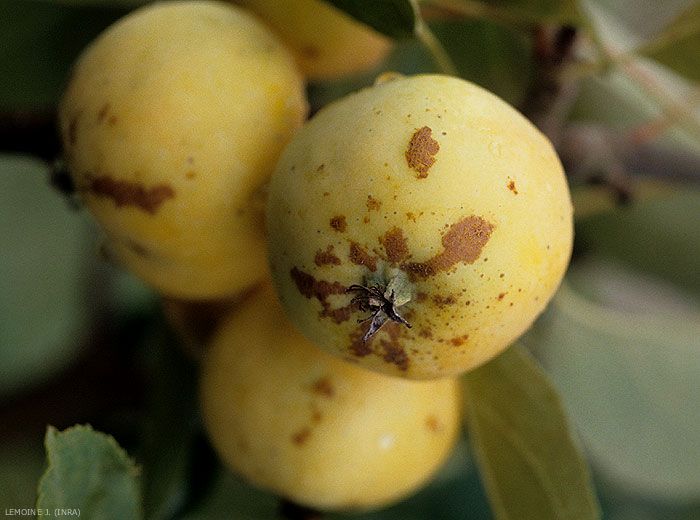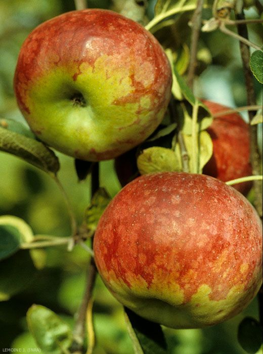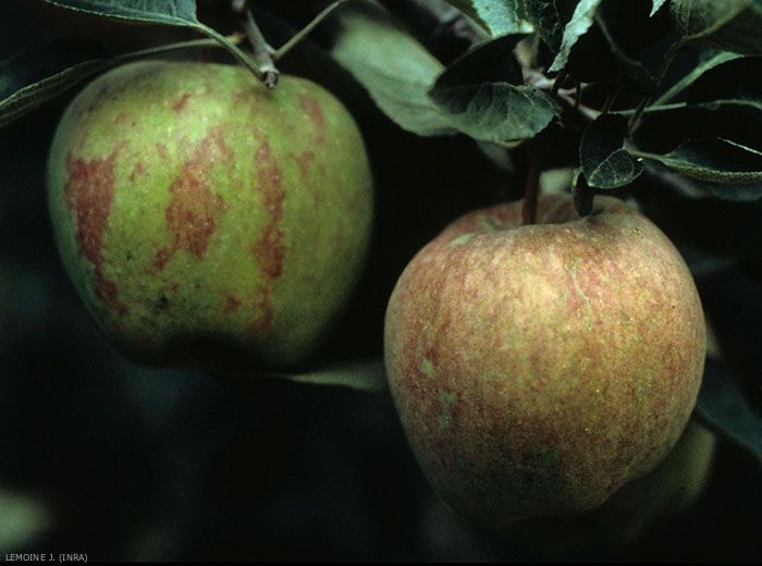 Sur les cultivars sensibles, seuls les fruits sont affectés. Le symptôme pomme pommelée s’observe sur des cultivars à épiderme rouge, particulièrement sur les groupes variétaux Red Delicious, Fuji et Elstar, mais aussi sur les variétés Akane, Cortland, Querina, Sunrise, etc. Dès la mi-juillet, des petites taches ou plages décolorées, superficielles, dispersées mais plus concentrées vers le nombril, ressortent sur le fond rouge. Seul l’aspect des pommes est altéré. Sur d’autres cultivars très sensibles tels que Braeburn, Belchard, Stark’s Earliest et la variété japonaise Indo, l’ASSVd provoque des lésions importantes sur les pommes : zones russetées semblant rayonner à partir de la cavité oculaire, ou craquelures profondes dispersées sur tout le fruit. C’est l’affection dite de l’épiderme balafré du pommier. Sur les arbres atteints presque toutes les pommes sont nécrosées, non commercialisables. Les cultivars des groupes variétaux Gala, Golden Delicious, Jonagold, Reine des Reinettes, Reinette Grise du Canada et Granny Smith sont apparus tolérants à très tolérants. Seuls quelques rares fruits portent des petites décolorations ou taches de rugosité (tableau).