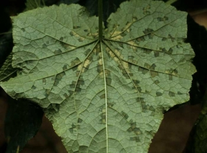 • Description : lésions humides, voire translucides à graisseuses, plus ou moins étendues, montrant une teinte sombre. Elles sont visibles sur les différents organes des légumes, sur les feuilles surtout (figures ), mais aussi la tige, les fruits.  Cet état des lésions est souvent assez fugace car elles deviennent progressivement brunes et nécrotiques en évoluant. Un halo jaune peut les ceinturer.