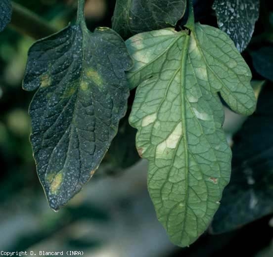 • Causes possibles : nombreuses maladies liées à des champignons pathogènes (cladosporioses - figure 1 ; Leveillula taurica (figure 2) et certains autres oïdium (figure 3), etc.) ou des organismes assimilés (agents de mildious - figures 4 à 6) ; de rouille blanche - figure 7), quelques virus, des phytotoxicités, etc.