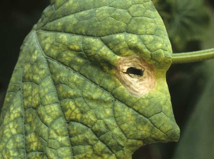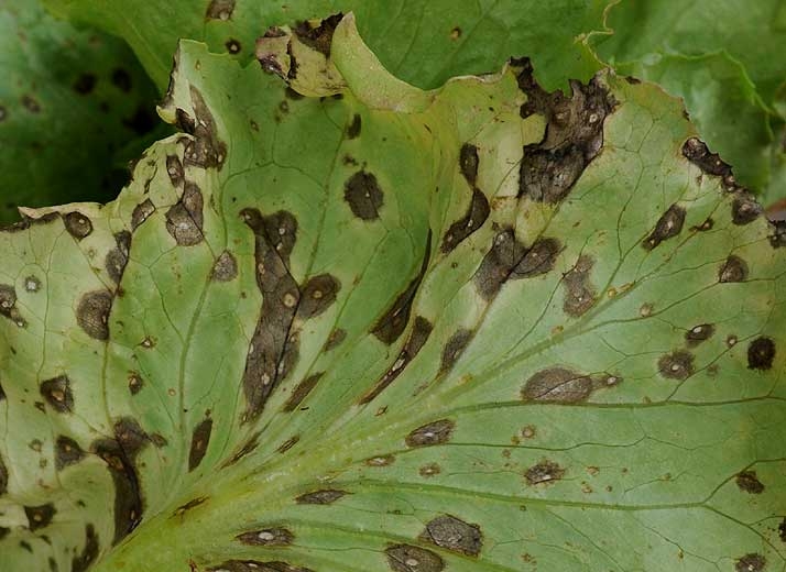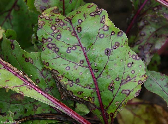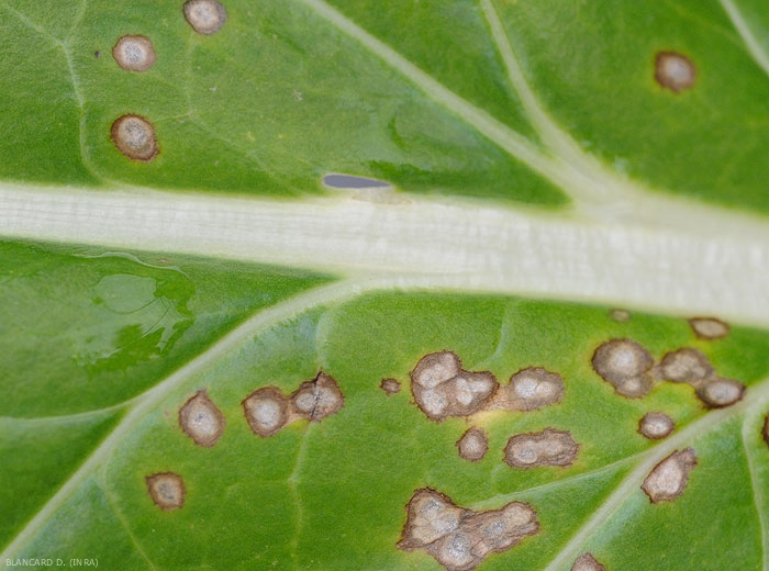 - Description : lésions souvent nécrotiques, plus ou moins étendues, présentant des motifs leur conférant l'aspect d'une cible (target spots). Elles peuvent être humides, voire translucides en début d'évolution. Elles sont surtout visibles sur les feuilles des légumes, parfois les tiges ou les fruits. Sur les feuilles, un halo, souvent chlorotique, peut les ceinturer. Notons que ce halo peut aussi contribuer à l'aspect concentrique de certaines taches.
