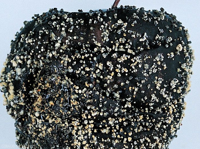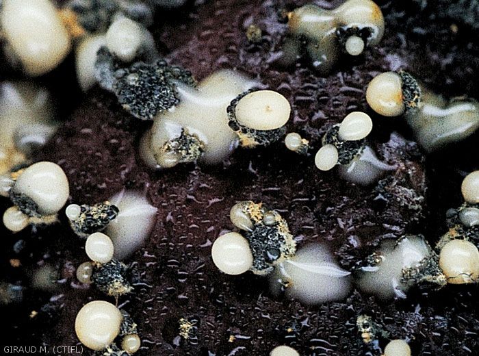Les symptômes sur fruits peuvent être confondus avec Monilia ou Alternaria. Mettre le fruit en chambre humide pour faire fructifier le champignon.
