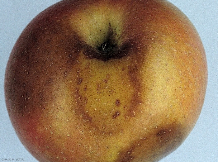 Au moment de la récolte, ce sont les fruits proches du sol ou souillés de terre qui peuvent être atteints, même en absence de symptômes au verger. En conservation, la pourriture sur fruits est ferme à contour diffus, de forme irrégulière, partant souvent des cavités oculaires et pédonculaires (figures 1 à 5). La couleur est marron avec parfois une teinte plus foncée en périphérie. A un stade très évolué, la peau se détache facilement. Les premiers symptômes apparaissent après deux à trois mois de stockage au froid en général, et quelques jours à température ambiante. En conditions très humides, il peut apparaître des filaments blancs sur la nécrose, ce caractère est moins exceptionnel sur poire que sur pomme.