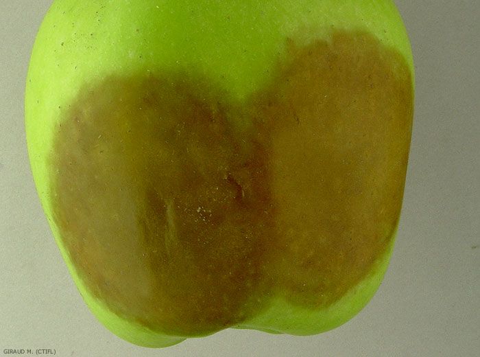 Au moment de la récolte, ce sont les fruits proches du sol ou souillés de terre qui peuvent être atteints, même en absence de symptômes au verger. En conservation, la pourriture sur fruits est ferme à contour diffus, de forme irrégulière, partant souvent des cavités oculaires et pédonculaires (figures 1 à 5). La couleur est marron avec parfois une teinte plus foncée en périphérie. A un stade très évolué, la peau se détache facilement. Les premiers symptômes apparaissent après deux à trois mois de stockage au froid en général, et quelques jours à température ambiante. En conditions très humides, il peut apparaître des filaments blancs sur la nécrose, ce caractère est moins exceptionnel sur poire que sur pomme.