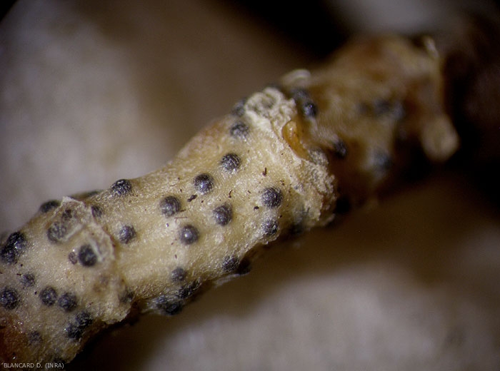 De minuscules structures sphériques noires, des périthèces de M. cannoballus et des ascospores, sont visibles à la surface des racines (figures 4 et 5) et caractérisent la présence de ce champignon. Ces signes, matérialisant la forme sexuée ou téléomorphe de cet ascomycète, ne sont pas toujours aisés à observer car ils peuvent se former sur des tissus racinaires déjà bien décomposés qui ne seront pas récupérés lors de l'arrachage des systèmes racinaires. Aussi, prenez soin d'arracher délicatement ces derniers en vous aidant d'un outil aratoire.