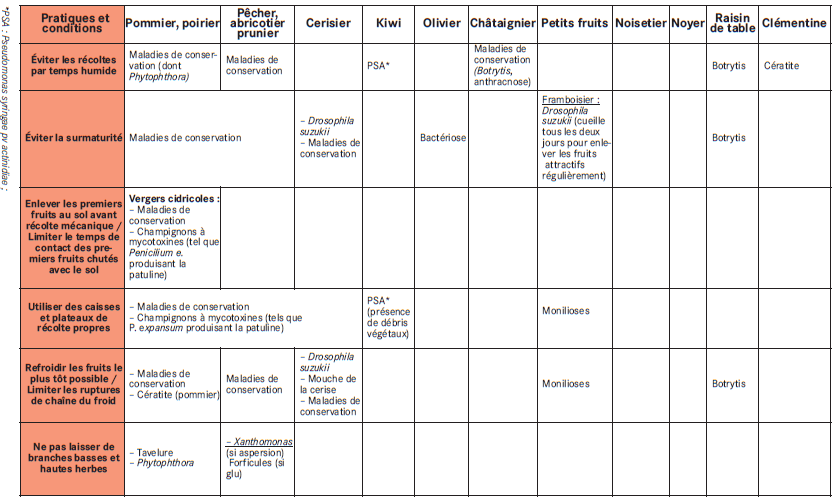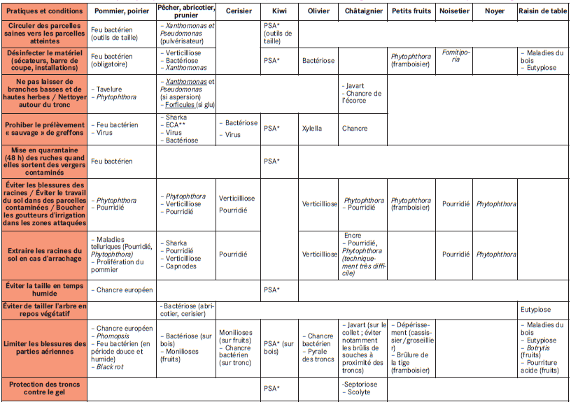 Certaines bonnes pratiques sont à mettre en œuvre pour limiter les contaminations et les disséminations des bio-agresseurs et ne pas accentuer les risques de leur développement. Les tableaux 2 et 3 (cf. Figures 1 et 2) recensent certaines bonnes pratiques à suivre en fonction de l’espèce fruitière et du bio-agresseur concerné.