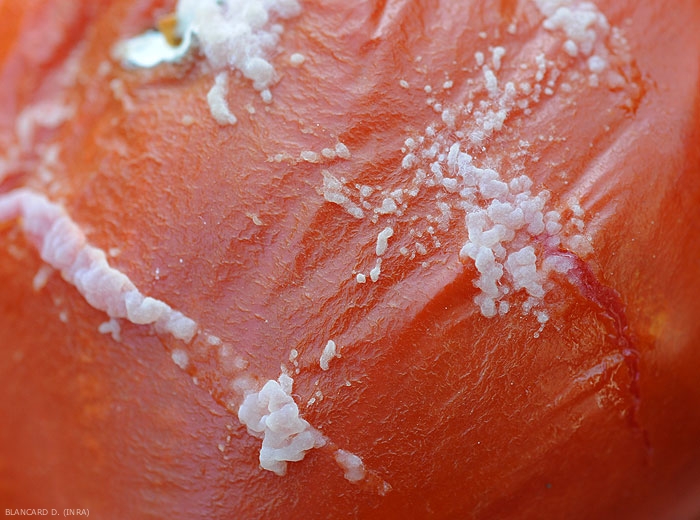 Description : fluides végétaux hébergeant de nombreuses cellules bactériennes en masse leur conférant une consistance plus ou moins visqueuse. Ils prennent la forme de gouttelettes plus ou moins laiteuses perlant de certains tissus végétaux contaminés (figures 1 et 2).