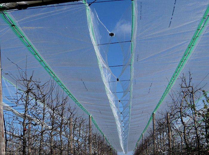 - Infrastructure du verger adéquate (poteaux enfoncés de 1 m, câble de faîtage, câbles transversaux)