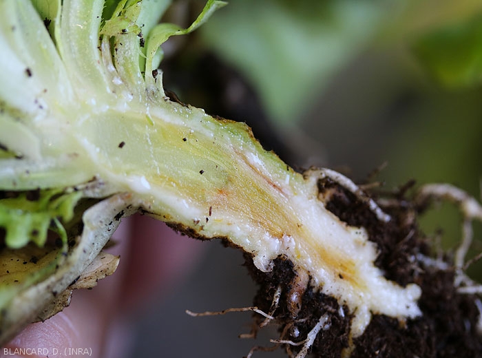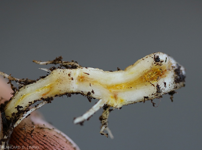 - Lésions racinaires et vasculaires comparables sur plantes adultes, avec des vaisseaux de couleur brune ;