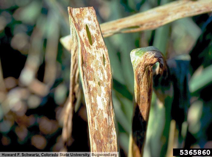 Présence principalement sur les feuilles de taches blanchâtres et humides évoluant vers un aspect de brûlures à