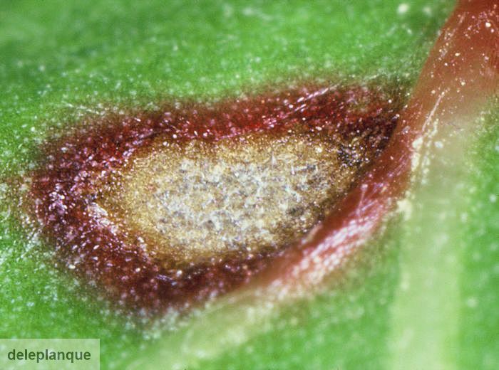 Sur face supérieure des feuilles, présence de petites taches (1 à 4 mm) circulaires grisâtres auréolées d’un cerne brun rouge, déprimées en leur centre, et couvertes d’un duvet gris formé des conidiophores et de conidies.