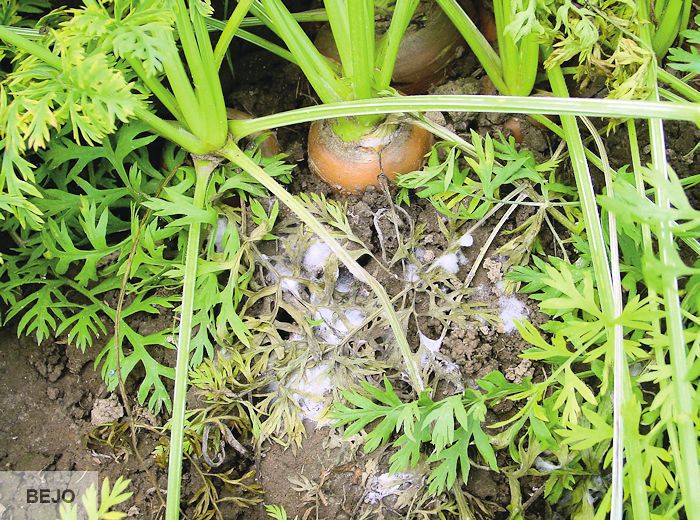 - pour la culture suivante : pratiquer des rotations en évitant de cultiver des espèces sensibles (pois, haricot, fenouil, laitue…), éliminer les résidus de culture malades afin de minimiser la présence de sclérotes