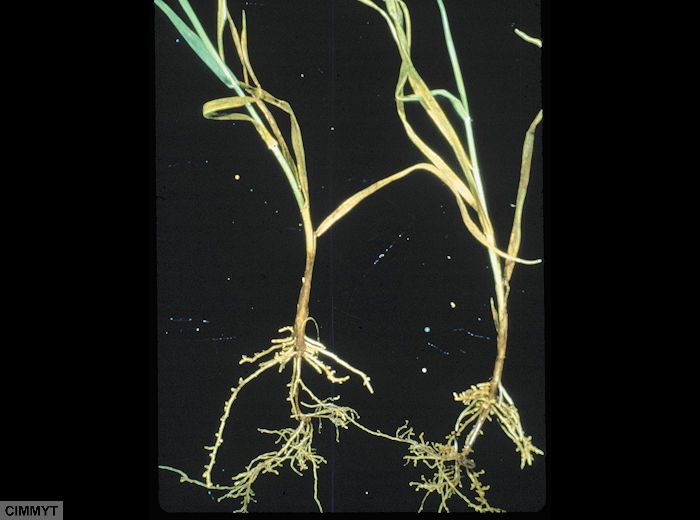 Les symptômes aériens sont généralement difficiles à détecter sauf en cas de fortes infections. Ils se traduisent par un retard de croissance, un manque de vigueur voire un flétrissement de la plante sous un stress hydrique.
