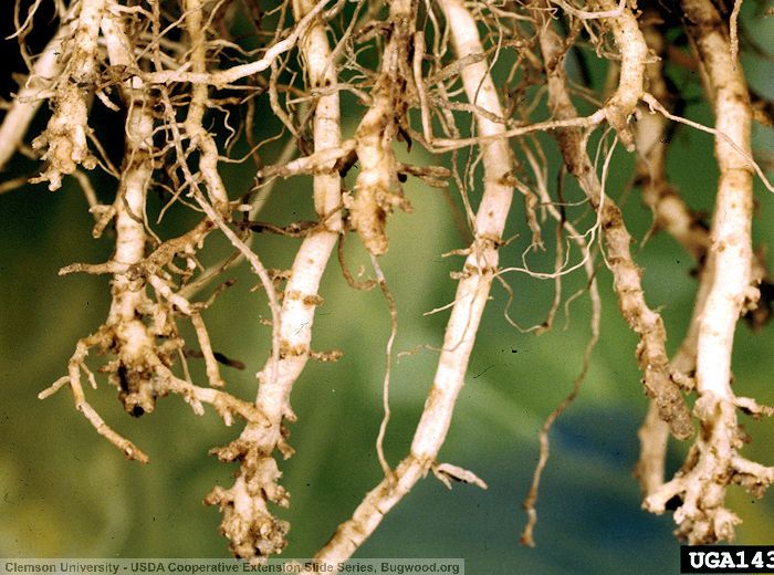 L’observation des racines des plants touchés permet de constater la présence de galles ainsi que des nécroses et des déformations.