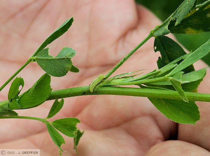 - larve (5-6 mm de long) : blanche à tête jaunâtre. Elle s’enfonce dans le sol et vit aux dépens des nodosités bactériennes, puis s’attaque aux radicelles et aux racines.