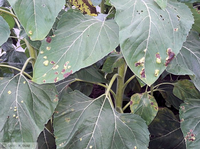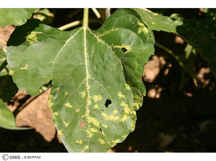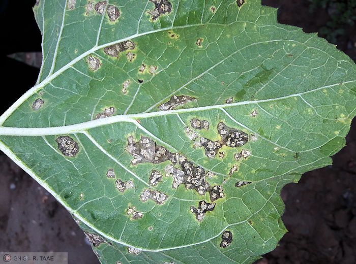 Des symptômes peuvent aussi se déclarer sur pétioles, tige et bractées du capitule, sous forme de taches superficielles vert glauque et d’un aspect huileux.