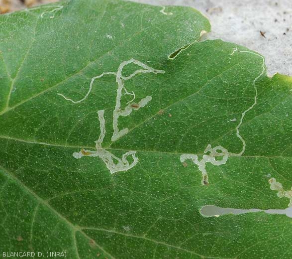 Sur feuilles : présence de petits points blancs correspondant des piqûres nutritionnelles des adultes, et surtout des dégâts de galeries sinueuses provoquées par les larves.