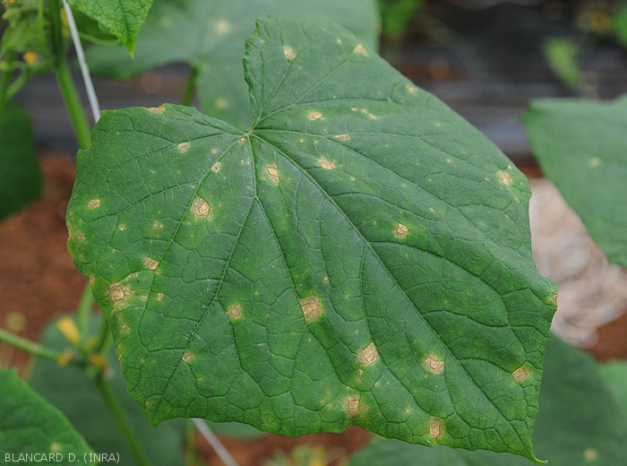 Petites lésions humides délimitées par les nervures, visibles sur les deux faces du limbe (figures 1 à 5).