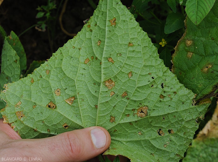 Ces lésions s'étendent et se nécrosent progressivement prenant une teinte beige à brun clair (figures 2 à 10). Le limbe en périphérie des taches est plus ou moins chlorotique (figure 5), et certaines d'entre-elles montrent de discrets motifs concentriques. (figure 10)
