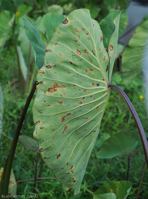 Petites lésions humides apparaissant à la face supérieure des feuilles, de teinte brun rougeâtre (figure 1).