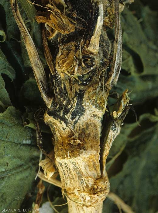 Lésions initialement humides et vert sombre sur tiges et pétioles, brunissant et se nécrosant progressivement (figures 1 à 3).