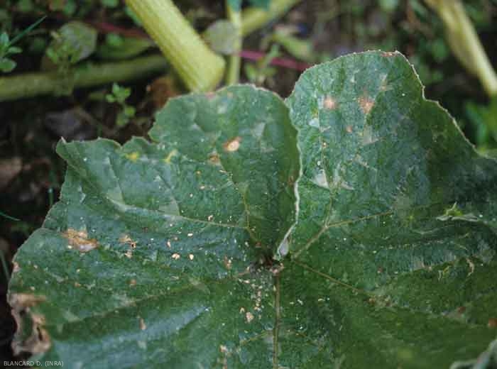 Taches sur feuilles huileuses à livides. De forme plutôt circulaire, elles s'étendent en évoluant, prennent une teinte brune, se nécrosent et se dessèchent (figure 3). Notons qu'elles peuvent être localisées en bordure du limbe dans un premier temps, et qu'un halo jaune les ceinture parfois.