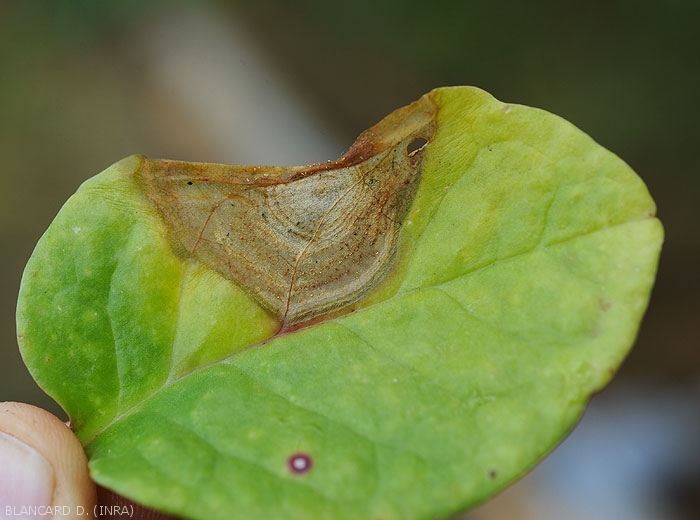 • Initialement, lésions circulaires humides à graisseuses situées sur le limbe ou en périphérie.