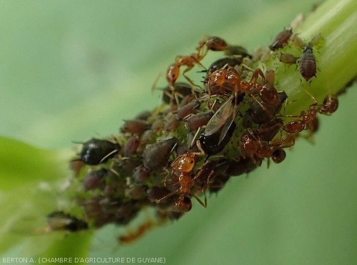 - Signes : Présence de larves et d'adultes sur les organes affectés (figures 2, 10 à 15). En plus des colonies de pucerons, des mues blanches sont fréquemment observées à la surface des organes aériens, ainsi que la présence de miellat rapidement colonisé par des champignons opportunistes à l'origine de la fumagine (sooty mold) (figures ). Rappelons que cette dernière entraine une réduction de la photosynthèse et de la respiration foliaire et rend les productions non commercialisables.