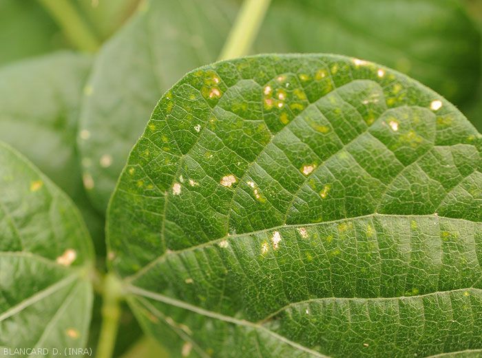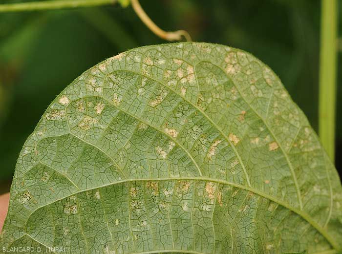 • Nombreuses et minuscules lésions argentées, voire des plages de taille et de forme irrégulières apparaissent sur le limbe (figure ) ; elles se nécrosent progressivement et prennent une teinte beigeâtre.