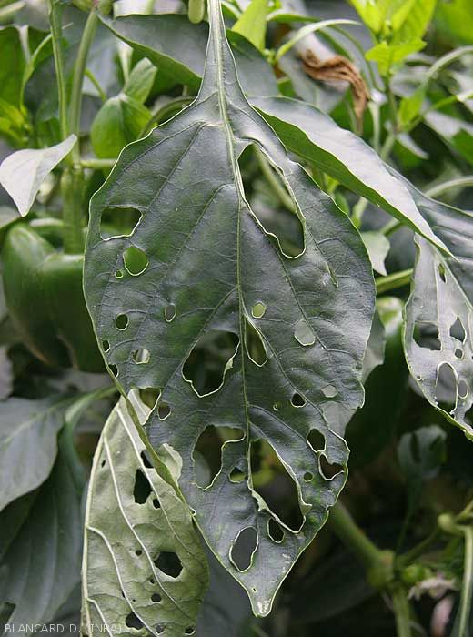 - Consommation des apex et des feuilles et folioles par les larves, notamment les plus âgées. Elles forment de larges trous situées sur le limbe ou à sa périphérie, ne laissant parfois derrière elles que les nervures principales et réduisant ainsi fortement la photosynthèse.
