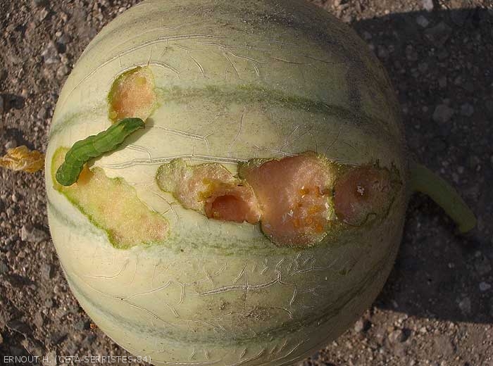 - Perforation des tiges et des fruits qu'elles envahissent par la suite. En plus des perforations, des galeries et de cavités sont observées. De nombreuses déjections sont visibles à l'intérieur et aussi à l'extérieur. Les fruits parasités par exemple de tomate cessent de grossir, mûrissent prématurément et tombent. Soulignons que ces perforations facilitent la pénétration de nombreux agents de pourritures, comme Choanephora cucurbitacearum, etc.