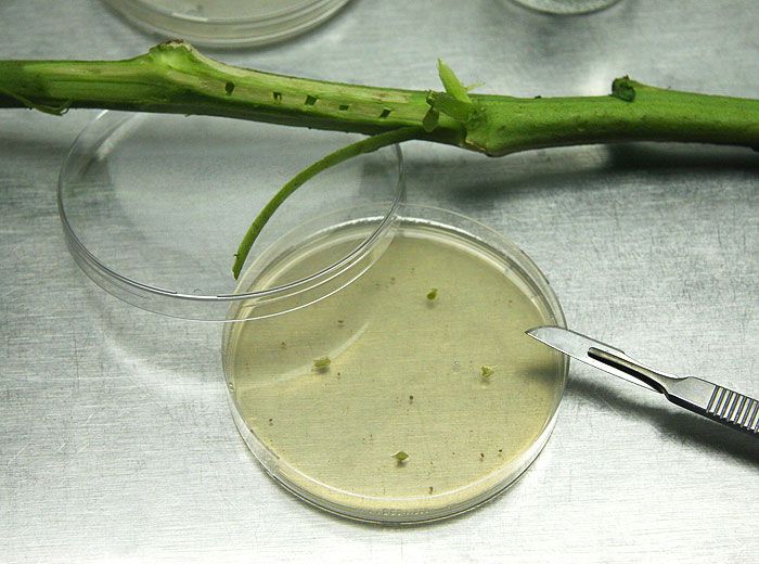 • Procédure : les échantillons de plantes malades sont souvent lavés et surtout désinfectés avant de réaliser des isolements : flambage à l’alcool, trempage dans des solutions désinfectantes (hypochlorite de calcium ou de sodium, etc.). Par la suite, des fragments de tissus prélevés à la limite des tissus sains et altérés sont prélevés et déposés sur un milieu de culture réparti en boîte de Petri (par exemple sur milieux Malt-agar ou PDA pour les champignons). Pour les bactéries, les fragments sont mis en suspension dans de l’eau stérile et dilacérés, puis une aliquote est déposé sur le milieu de culture (par exemple LPGA) et étalé à l‘aide d’une pipette Pasteur boulée. Dans les heures, voire les jours qui suivent, des colonies mycéliennes se développent progressivement autour des explants, et des colonies bactériennes plus muqueuses apparaissent sur le milieu de culture.