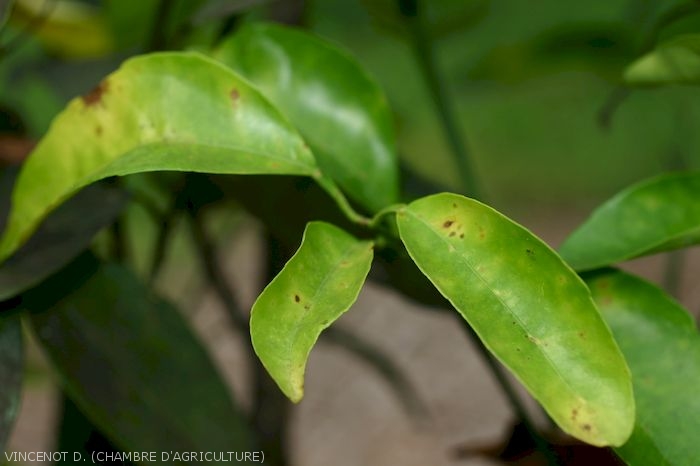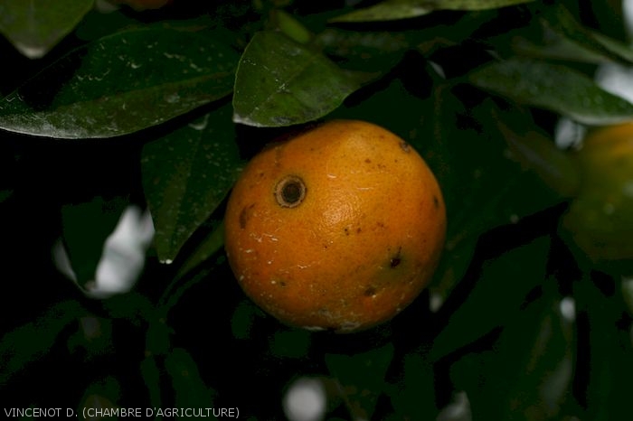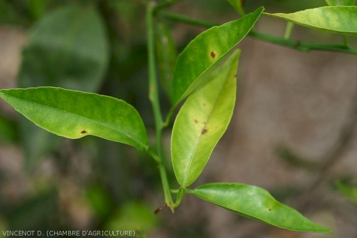 - Feuilles et fruits : présence de petites taches foncées entourées d'un halo plus clair.