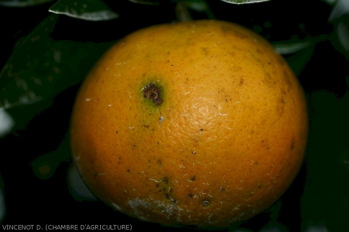 - Fruits : le mycélium issu de la germination des spores pénètre par des microfissures et colonise les tissus puis arrête sa croissance. Sur fruit mûr, la croissance reprend et conduit à la formation de petites taches noires, rondes, superficielles, se développant autour des lenticelles. Les tâches sont souvent concentrées dans la région pédonculaire. Ces taches peuvent croître, confluer en de larges plages noires et s’étendre dans la pulpe.