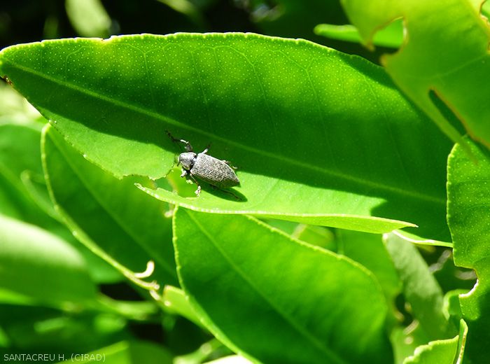 Susceptibles de se nourrir au stade adulte du feuillage des agrumes, ce ravageur polyphage provoque principalement des dégâts sur les jeunes plants, les arbres adultes pouvant supporter un certain niveau de populations de charançons.