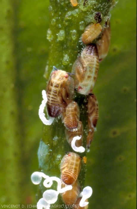 Les femelles peuvent pondre plus de 800 œufs, déposés sur les jeunes pousses. Les larves restent mobiles tout au long des 5 stades larvaires. S'alimentant au début de jeunes bourgeons, elles migrent à partir des stades 4 et 5, vers les pétioles ou les brindilles vertes. Ces larves sécrètent un miellat cireux blanchâtre qui donne à la plante hôte un aspect poussiéreux puis noirâtre, à la suite du développement de fumagine.