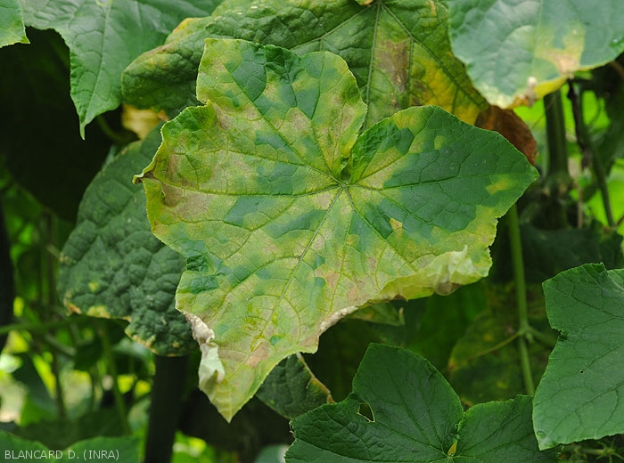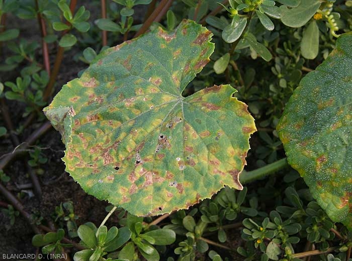 A terme, le limbe présente une mosaïque en taches jaunes et/ou brunes si les lésions sont nécrosées (figures 2 et 6).