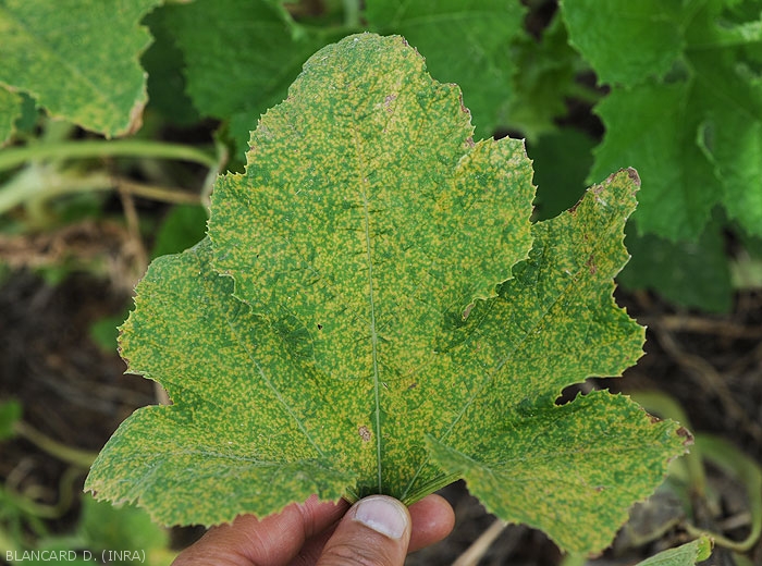• Signes : présence d'un feutrage à la face inférieure du limbe dont la coloration varie du gris clair au mauve foncé. Ce feutrage est plutôt difficile à observer sur ces diverses Cucurbitacées étant donné la taille réduite des lésions.