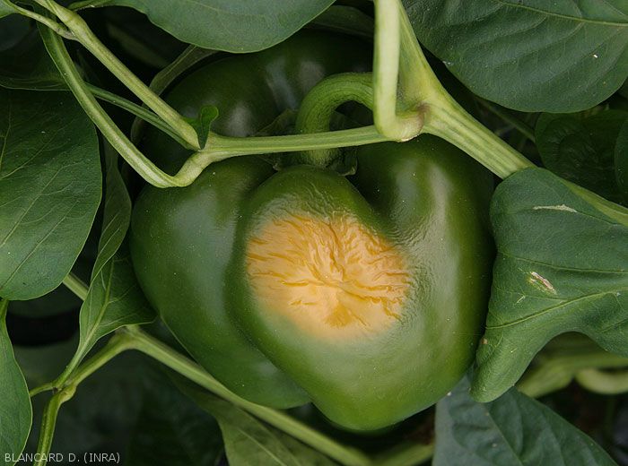 • taches plutôt étendues sur la face des fruits la plus exposée au rayonnement direct du soleil, irrégulières, blanchâtres en leur centre, et plus ou moins entourées d'un halo jaune. Elles sont légèrement déprimées, et leur surface est plus ou moins ridée et prend une texture sèche rappelant celle du papier.