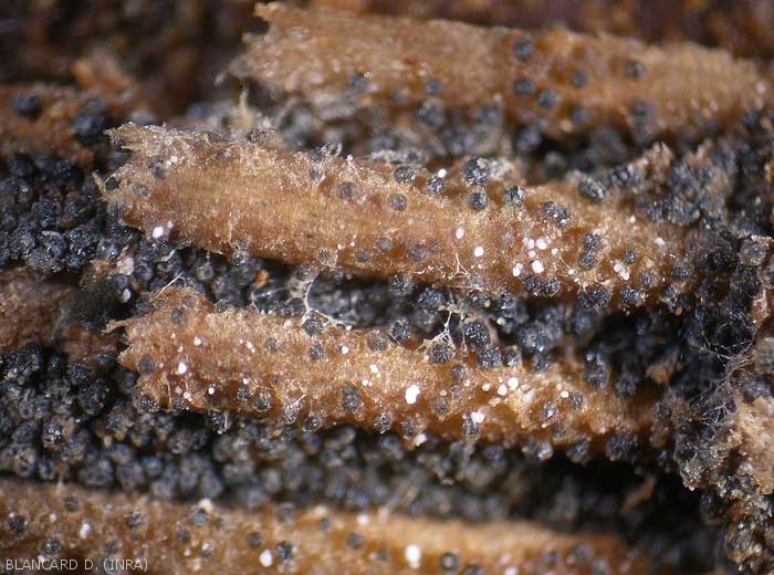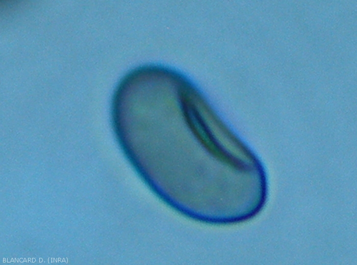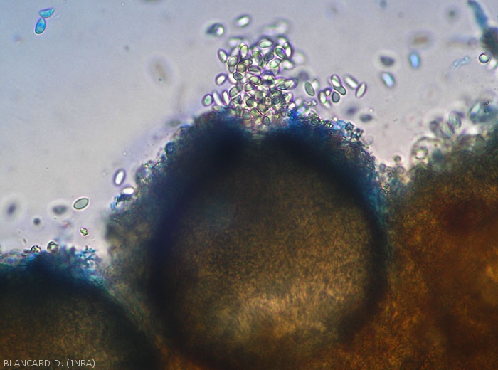 L'intérieur de chaque pycnide est tapissé de nombreux conidiophores hyalins (figure 4) à l'extrémité desquels se forment des conidies lisses, unicellulaires et d'abord hyalines (figures 5 à 8). De forme elliptique à ovoïde (8-16 x 5-7 µm), celles-ci se mélanisent au fil du temps (figures 9 et 10).